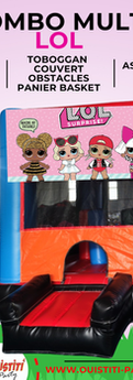 La structure gonflable COMBO est un jeu gonflable "multiplay" qui plaira à vos enfants. Couverte pour le soleil et les fines pluies, dans son intérieur vous avez la zone de rebonds avec des obstacles, une échelle pour accéder au toboggan qui est aussi couvert. Il possède des filets sur tous les cotés afin de bien y voir les enfants, bien aérée et pour leur sécurité.